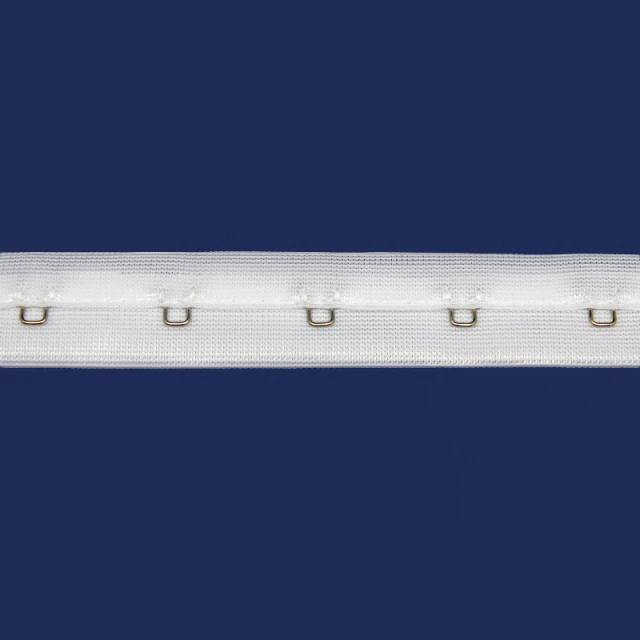 Fecho para lingerie em cadarço de poliamida, vendido por metro, preto, com argolas de aço niquelado, para passagem de cordões ou fitas. Usado no fechamento de tops, espartilhos, corseletes, vestidos de noite, e outras aplicações.