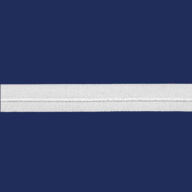 Elástico dobrável de 14 mm de largura aberto, branco, para acabamento simples em mangas de blusinhas e jaquetas corta-vento, decotes, cós e pernas de calcinhas e roupas fitness, dentre outras utilidades. Também conhecido como viés elástico, elástico com vinco e elástico com dobra.