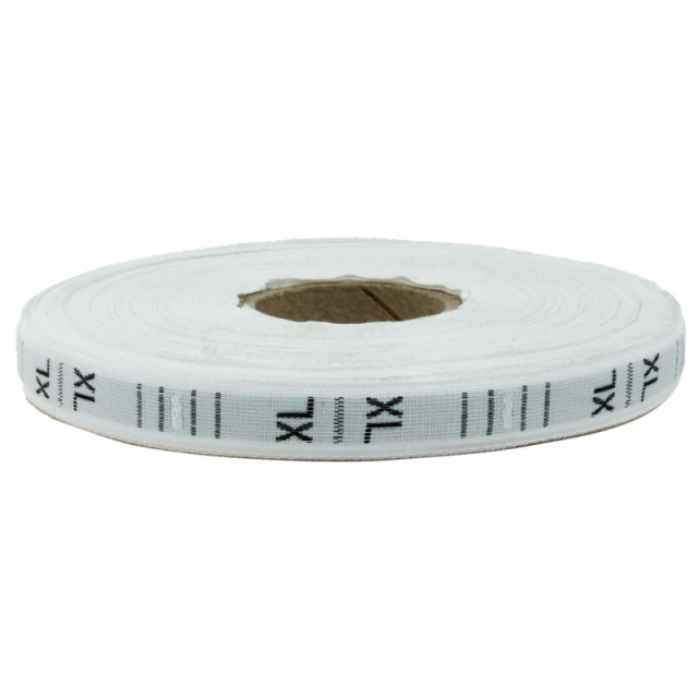 Etiqueta de tamanhos (manequins), bordada em tecido branco 100% poliéster com letras e números pretos. Com ourela (acabamento nas laterais) e marcações de dobra e corte. Cada tamanho vem bordado 2 vezes, espelhado, para fazer a dobra. Depois de costurada, cada etiqueta fica com 15 mm de comprimento máximo. Modelos disponíveis: do 1 ao 8 todos os números; números pares do 10 ao 18 e do 48 ao 56; letras S - XS - L - XL - G - EG - XG - XL e U em rolinhos com 625 etiquetas, aproximadamente.