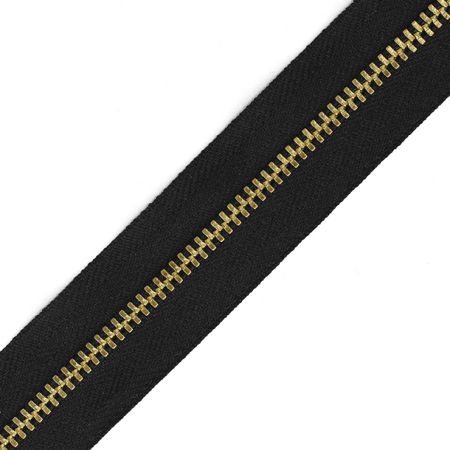 Zíper de metal médio, acabamento dourado, por metro, para montagem. Pode ser aplicado em calças, saias, bermudas, vestidos e outros modelos em tecidos médios. Utilizar cursor para zíper de metal 045 médio YKK. OBS.: os terminais (superiores e inferiores) são vendidos separadamente, consulte nesta seção.