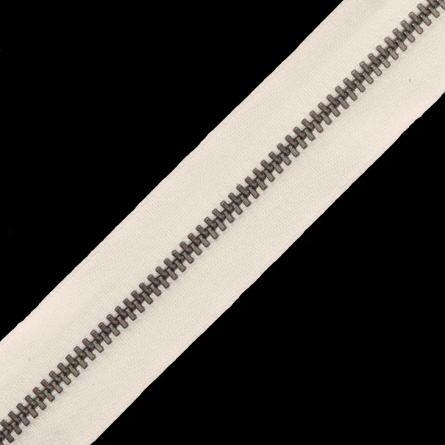 Zíper de metal médio, acabamento prata velha, com cadarço misto para tingimento, por metro, para montagem. Este cadarço permite tingimento porque é revestido de algodão cru, garantindo excelente fixação de cor. Pode ser aplicado em detalhes de bolsos em calças, saias, bermudas, vestidos e outros modelos em couro e tecidos médios. Utilizar cursor para zíper de metal 045 médio YKK. OBS.: os terminais (superiores e inferiores) são vendidos separadamente, consulte nesta seção. SOMENTE NA COR CRUA.