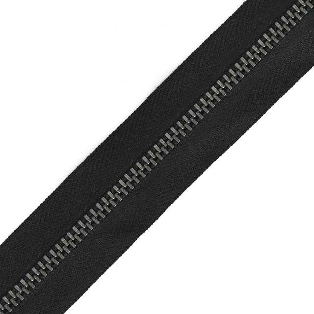 Zíper de metal médio, acabamento prata velha, por metro, para montagem. Pode ser aplicado em detalhes de bolsos em calças, saias, bermudas, vestidos e outros modelos em couro e tecidos médios. Utilizar cursor para zíper de metal 045 médio YKK. OBS.: os terminais (superiores e inferiores) são vendidos separadamente, consulte nesta seção.